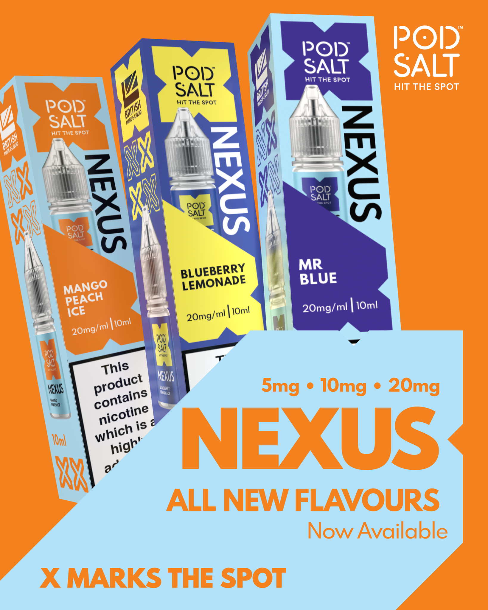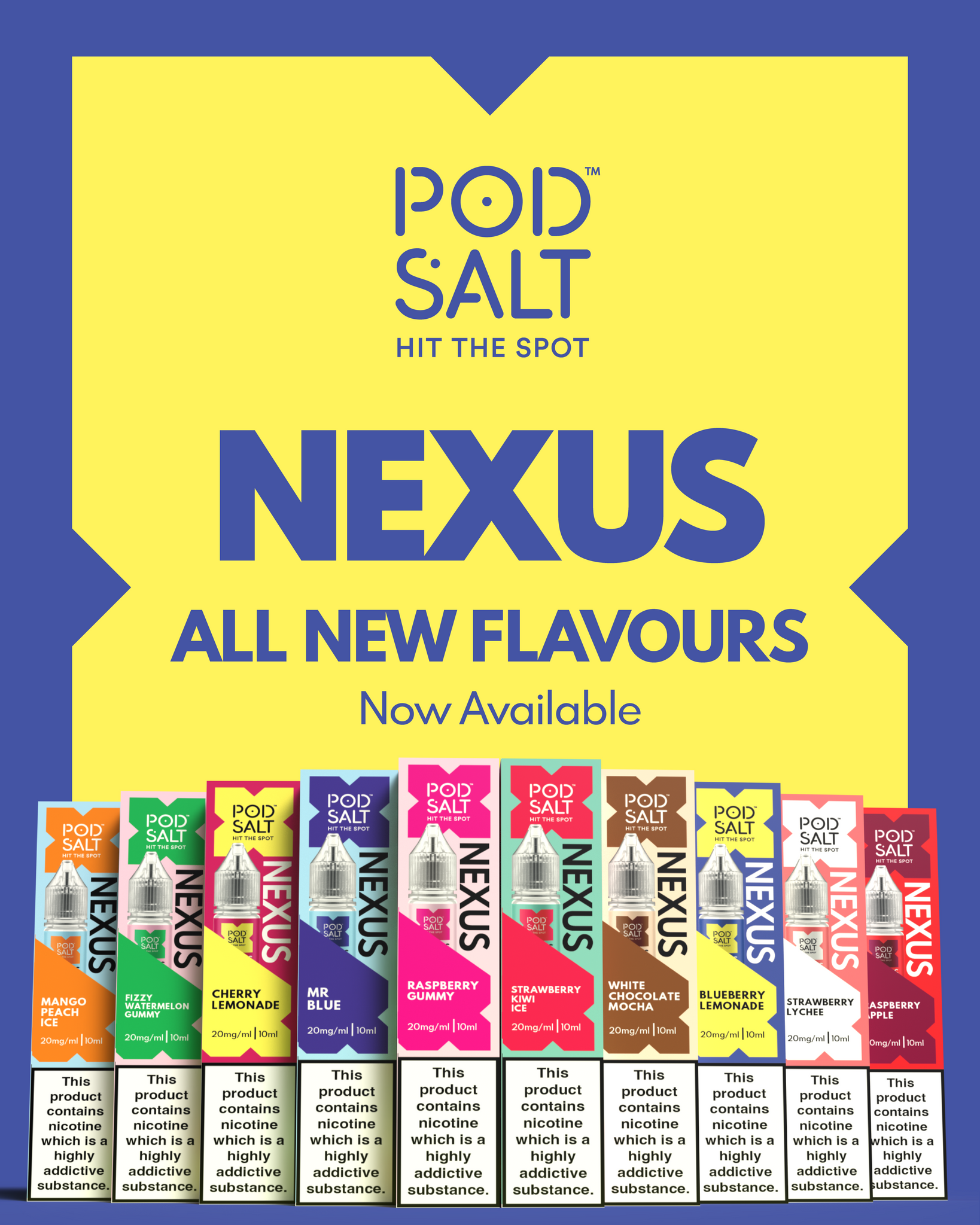 Pod Salt Nexus Salt. 10ml of 5mg, 10mg or 20mg salt nicotine e-liquid. 50% VG / 50% PG and flavourings.